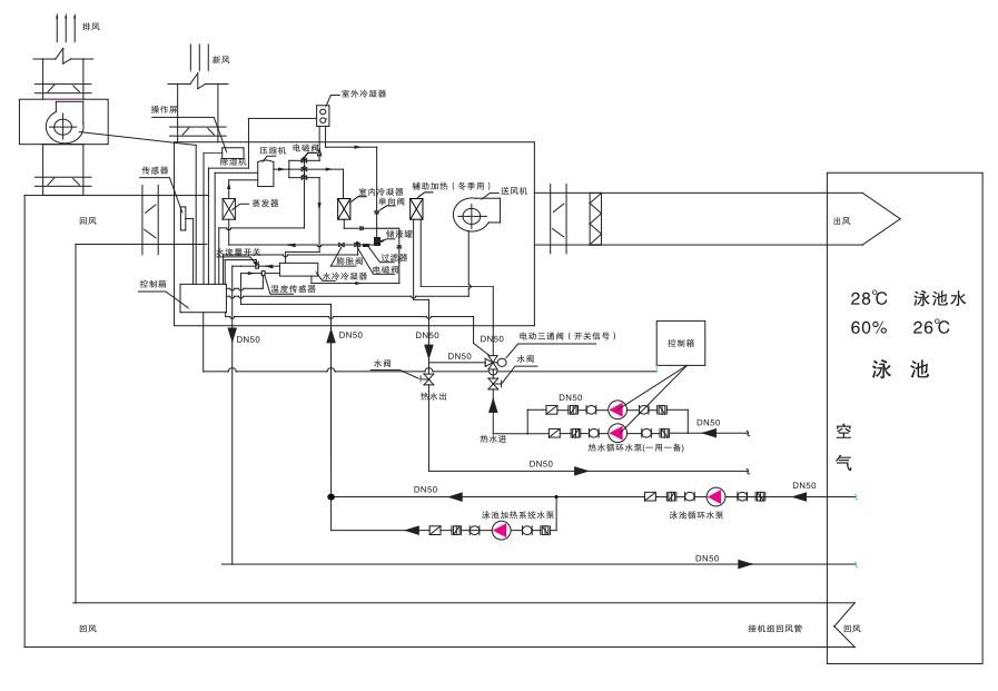 機組工作原理圖:輔助加熱系統水管接自鍋爐熱水;風(fēng)管的尺寸參數,送、回風(fēng)風(fēng)管圖,水系統水管管徑如圖所標。